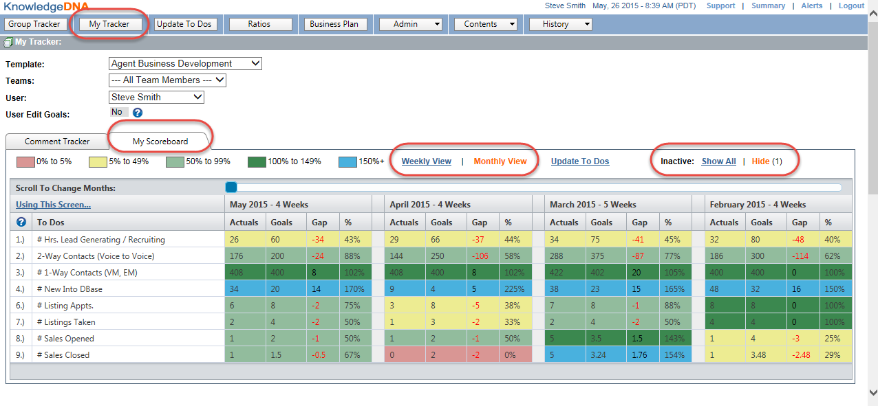 viewed in a compiled Monthly or Weekly view. The My Scoreboard page will show you the Actuals, Goals, Gap between Goals and Actuals,